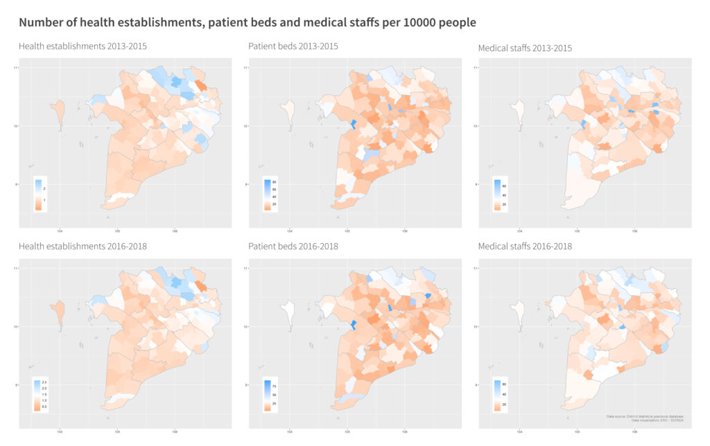 Healthcare facility in the Mekong Delta is lagged behind that of the national average when comparing some main indicators (orange and blue symbolize the districts under and above national average, respectively).