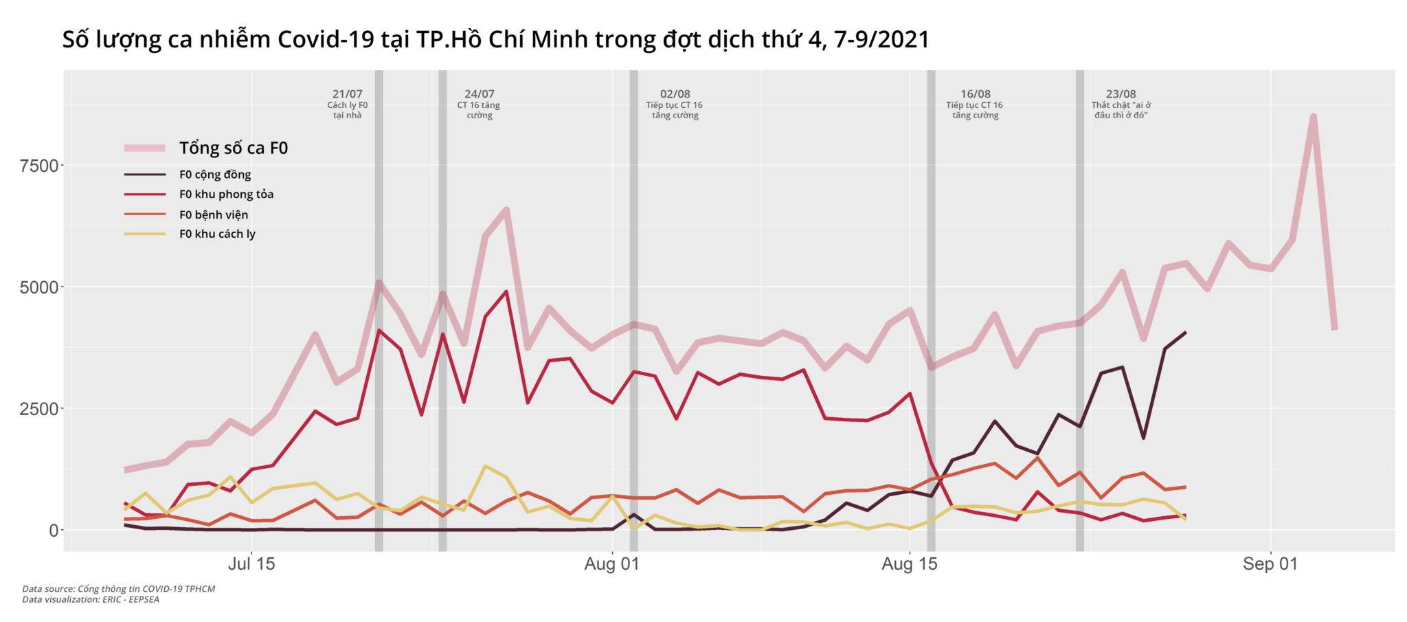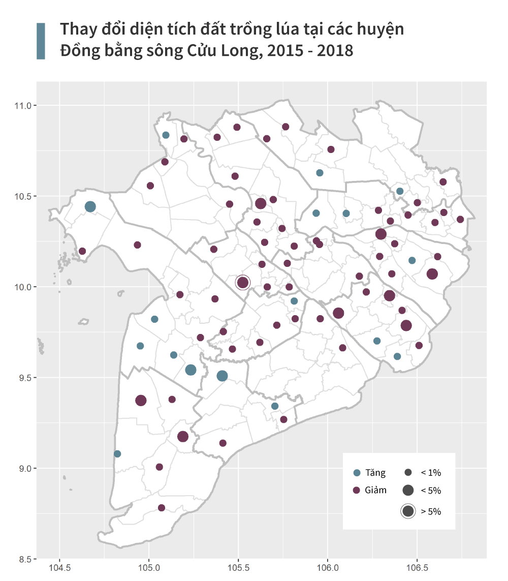 The area of rice dropped in almost all districts. This is especially true in districts nearby major rivers of Mekong.