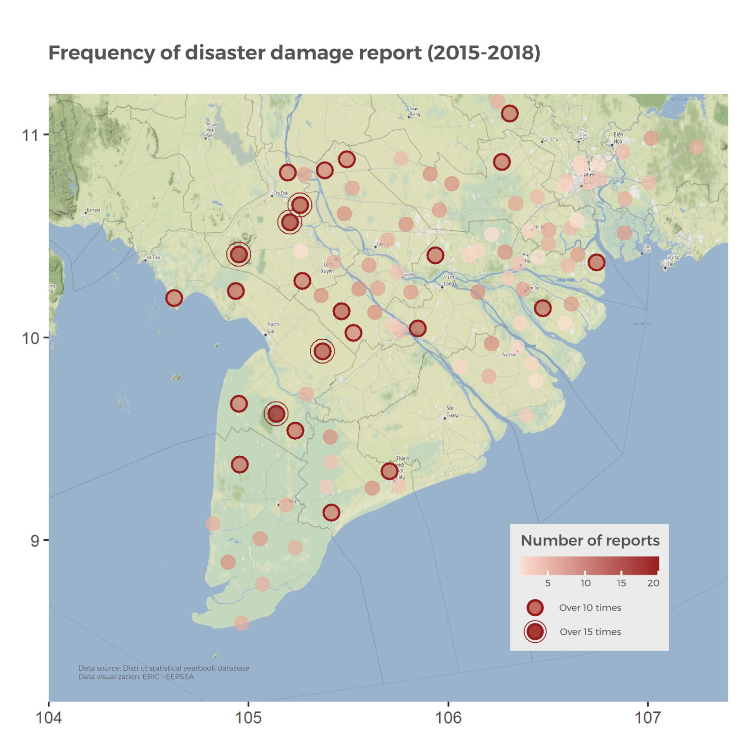 The districts which are near major rivers in the Mekong Delta reported disaster damage in higher frequency in the 2015-2018 period.