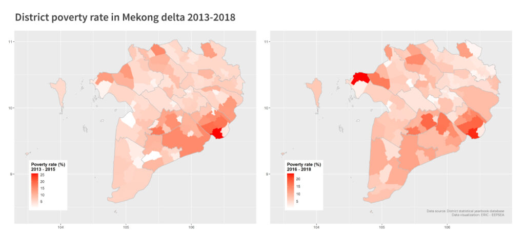 The poverty rate is higher in the coastal area and the upstream area of the Mekong River. The poverty rate is higher in the period of 2016-2018.