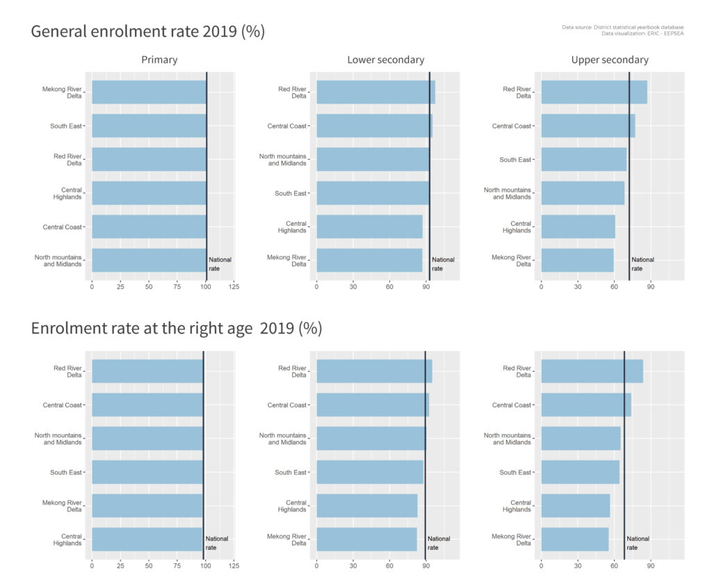 The discrepancy in enrollment rate between regions appears in lower and upper secondary. The rates of the Mekong delta dropped into the bottom position in ranking.